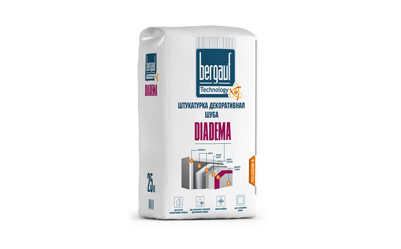 Штукатурка декоративная Bergauf Diadema используется под покраску. Подходит для следующих типов основания: кирпичная кладка, бетон, железобетон, ячеистый бетон, цементная, цементно-известковая штукатурка, гипсовая щтукатурка, гипсокартон. Для внутренних работ в помещениях с нормальной и повышенной влажностью, а также для наружных работ.