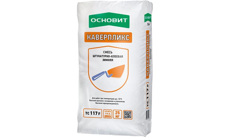 Штукатурно-клеевая смесь ОСНОВИТ КАВЕРПЛИКС TC117 F ЗИМНИЙ предназначена для монтажа пенополистирольных и минераловатных плит, создания армированного базового штукатурного слоя при низких температурах окружающего воздуха от -10 до +10°C. Рекомендуется для создания “дышащих” систем утепления фасадов как новых, так и старых зданий. Для внутренних и наружных работ.